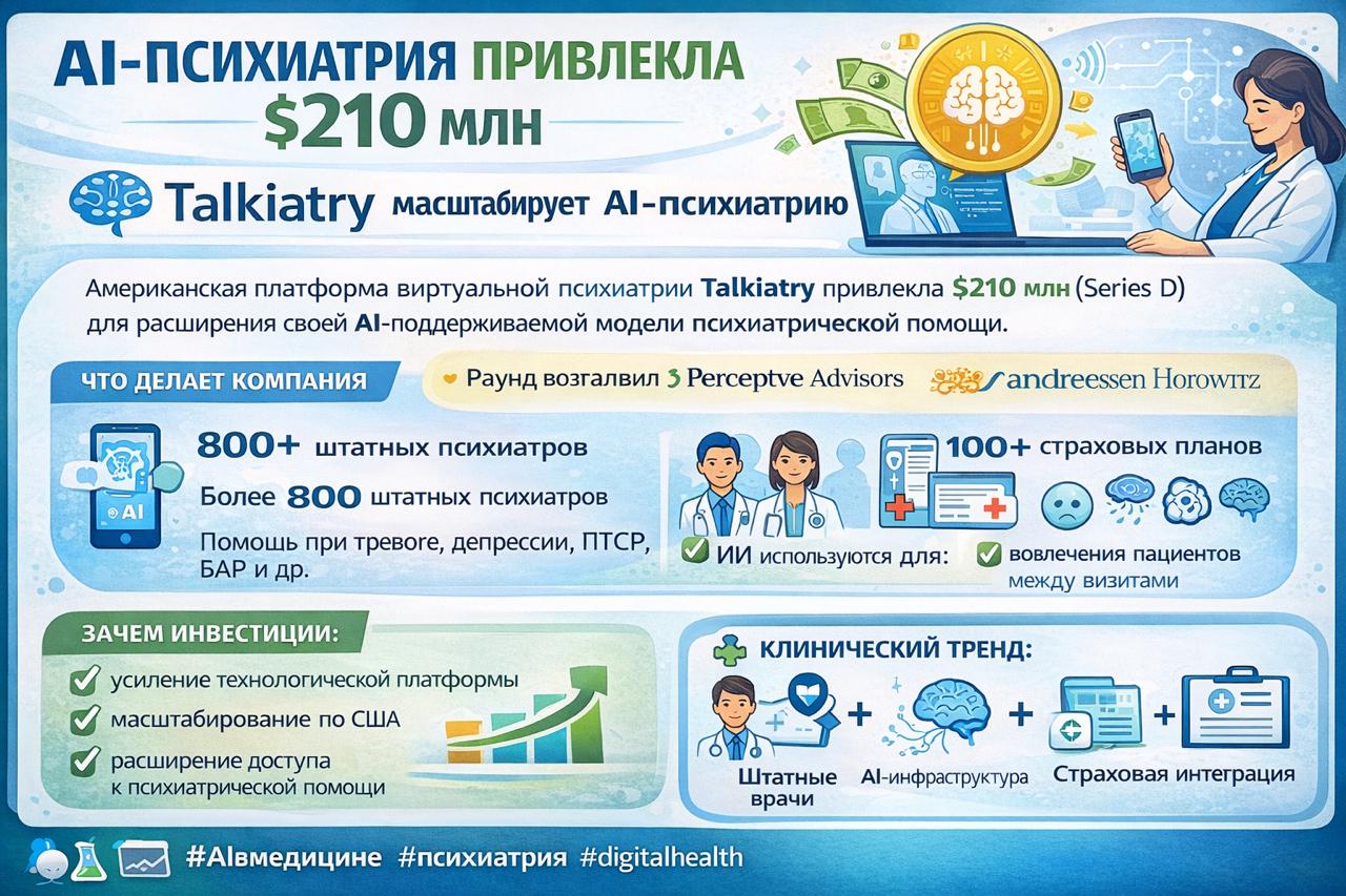 🧩 Клинический тренд: формируется новая модель психиатрии, объединяющая штатных врачей, AI-инфраструктуру и страховую интеграцию, что обеспечивает масштабируемую психиатрическую помощь.